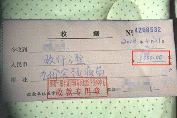 国家药品监督管理局相关文件显示,九价宫颈癌疫苗适用于16岁到26岁的女性,可以预防90%以上的宫颈癌。因为目前供应数量有限,一针难求的现象时有发生。微博爆料的王女士告诉记者,2018年1月份,她在朋友的介绍下来到博鳌银丰康养国际医院交了9000块钱,并注射了第一针九价宫颈癌疫苗。