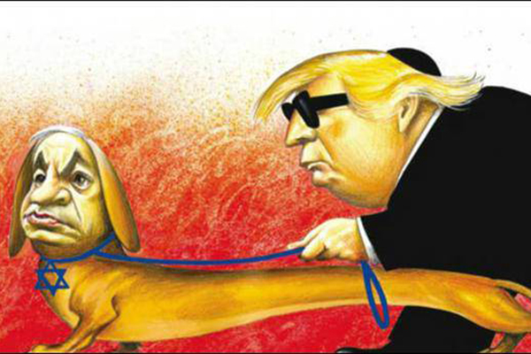 (观察者网讯)美国报纸《纽约时报》近日在其国际版刊出一则漫画,漫画中美国总统特朗普带着墨镜,牵着一只导盲犬,而导盲犬则是以色列总理内塔尼亚胡。
