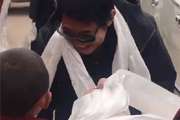 李连杰一下车就和当地的小朋友们亲密的打招呼,小朋友们也是主动的为他献上了当地象征着美好寓意的白色哈达,画面上看上去非常的和谐有爱。李连杰乘坐着一个不起眼的白色的轿车来到了这里,穿着寻常的衣服戴着一个墨镜,在面对小朋友的时候却笑的非常的可亲。旁边还有很多当地的人围在他身边在和他友好地打招呼,他也非常谦虚的弓着身给大家问好,没有一点架子。