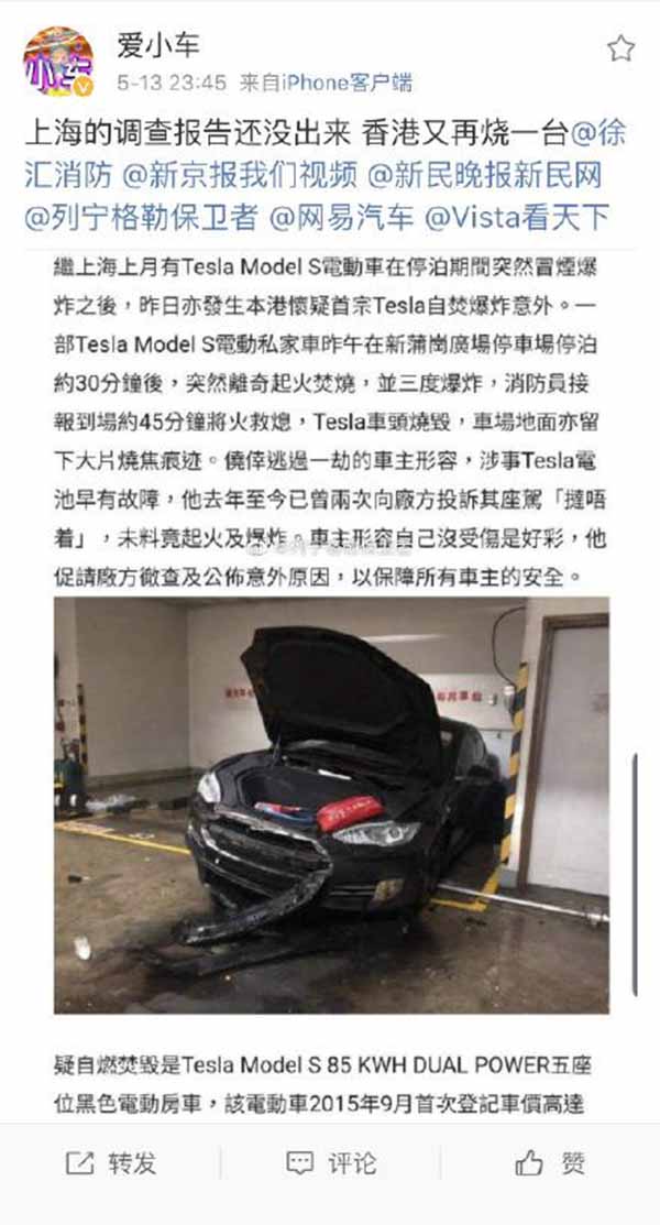 4.5月14日,特斯拉在香港一停车场内自燃。