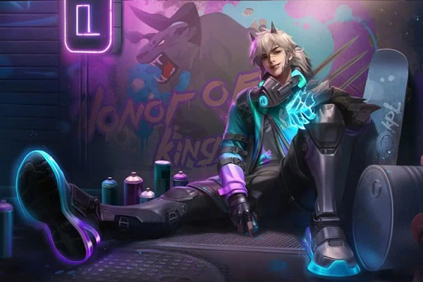 新皮肤天狼狩猎者在背景故事中是一个涂鸦师,整个皮肤设计以机能风为主,整个服饰采用明亮的渐变色以及不规则的潮范儿剪裁,搭配护具、尼龙带、几何纽扣等为装饰,局内特效斑斓的喷漆色彩。