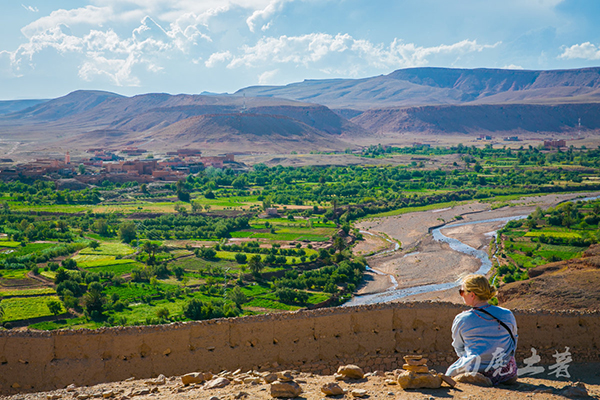 古堡建在有山有水的坡地上,一条护城河穿过新老村之间,斜光中,一位柏柏尔人走在逐渐浅去的河床上。