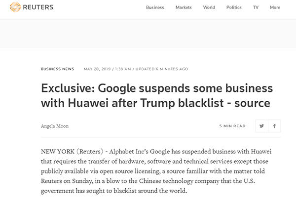 路透社19日援引知情人士的说法称,谷歌Alphabet已经暂停与华为的业务,除了通过“开放源码许可”公开可用的服务以外。该消息人士表示:“华为只能使用安卓系统的公共版本,但不能从谷歌获得专有应用程序和服务的访问。”此前一天,华为创始人兼总裁任正非18日接受日本媒体采访时抨击了特朗普政府将华为列入“黑名单”的决定,并坚称华为没有做任何违法行为。他还表示,即使高通和其他美国供应商不向华为出售芯片,华为也“没问题”,因为“我们已经为此做好准备”。