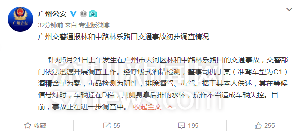 广州市公安局交警部门今日(5月21日)通报:5月21日8时50分许,天河区林和中路林乐路口发生一起交通事故。肇事车辆闯红灯并撞上行人及两辆汽车。据初步了解,事故造成13人受伤,其中2人伤势较重。接报后,广州交警会同天河区公安分局、卫健等部门迅速派员赶赴现场处置,目前受伤人员已送往医院救治,肇事司机丁某(女,45岁)已经被警方控制,事故原因正在进一步调查中。