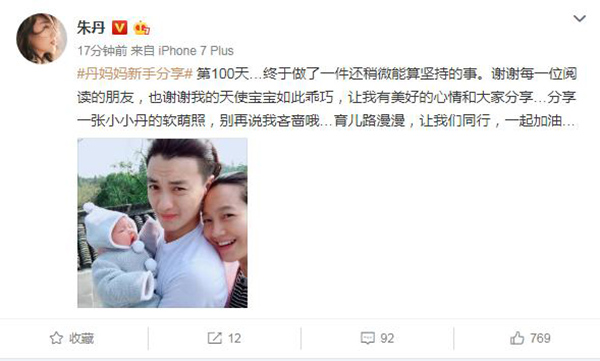 刚刚朱丹又发布了一则动态,恰好是她第一百天的新手分享记录。而这一次朱丹不再是晒出自己和女儿,或是周一围和女儿在一起的动态,而是大方的晒出一家三口的合影!要知道朱丹很少分享三口一起出镜的时刻,所以这次简直是粉丝和网友的福利!