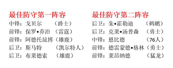 作为本赛季常规赛最佳防守球员的三位候选人,戈贝尔、保罗•乔治以及“字母哥”阿德托昆博的入选几乎没有悬念,三人均获得了90张以上的第一阵容选票。