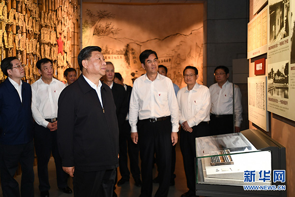 于都是中央红军长征集结出发地。1934年10月,中央机关、中央军委和中央红军主力在此集结出发,踏上漫漫征途。20日下午,习近平转乘火车来到于都县,瞻仰中央红军长征出发纪念碑,察看中央红军长征出发地旧址原于都县城东门渡口,参观中央红军长征出发纪念馆。在纪念碑前,习近平向革命先烈敬献花篮并三鞠躬。他缓步绕行纪念碑,仔细察看基座上的浮雕,深情缅怀当年党中央和中央红军在苏区浴血奋战的峥嵘岁月。纪念馆内,习近平听取中央红军长征集结出发历史情况介绍,在一张张图片、一件件实物前驻足察看,同大家不时交流,回忆当年的历史。他强调,今年是新中国成立70周年。我们一定要牢记红色政权是从哪里来的、新中国是怎么建立起来的,倍加珍惜我们党开创的中国特色社会主义,坚定道路自信、理论自信、制度自信、文化自信。革命理想高于天。理想信念之火一经点燃,就永远不会熄灭。在中央苏区和长征途中,党和红军就是依靠坚定的理想信念和坚强的革命意志,一次次绝境重生,愈挫愈勇,最后取得了胜利,创造了难以置信的奇迹。我们不能忘记党的初心和使命,不能忘记革命理想和革命宗旨,要继续高举革命的旗帜,弘扬伟大的长征精神,朝着中华民族伟大复兴的目标奋勇前进。今天,在新长征路上,我们要战胜来自国内外的各种重大风险挑战,夺取中国特色社会主义新胜利,依然要靠全党全国人民坚定的理想信念和坚强的革命意志。