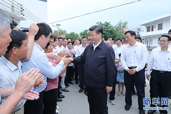 5月20日至22日,中共中央总书记、国家主席、中央军委主席习近平在江西考察,主持召开推动中部地区崛起工作座谈会并发表重要讲话。这是习近平在赣州市于都县梓山镇潭头村看望当地群众,同乡亲们亲切握手。 新华社记者 鞠鹏 摄