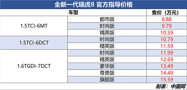 奇瑞全新一代瑞虎8于今晚正式上市,共推出10款,售价区间8.88——15.59万元。新车采用全新的设计风格,并搭载由奇瑞自主研发的全新1.6T发动机、ADAS驾驶辅助系统以及“雄狮智云”系统。除此之外,现款车型的1.5T发动机还将继续使用。