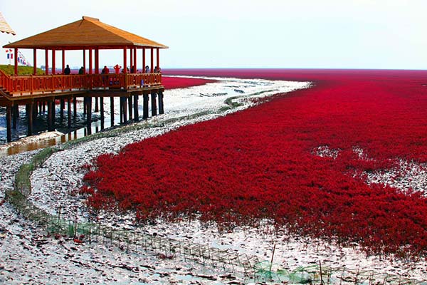 红海滩属于湿地生态地带,它保存完好、规模巨大,它与世界最大的芦苇荡相互依托,成为自然环境与人文景观的完美结合,景色壮观,目不暇接。