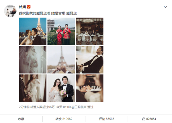 2019年6月2日,着名钢琴家郎朗在微博晒出九宫格婚纱照宣布了结婚喜讯,并配文:“我找到我的爱丽丝啦,她是吉娜·爱丽丝 ”。