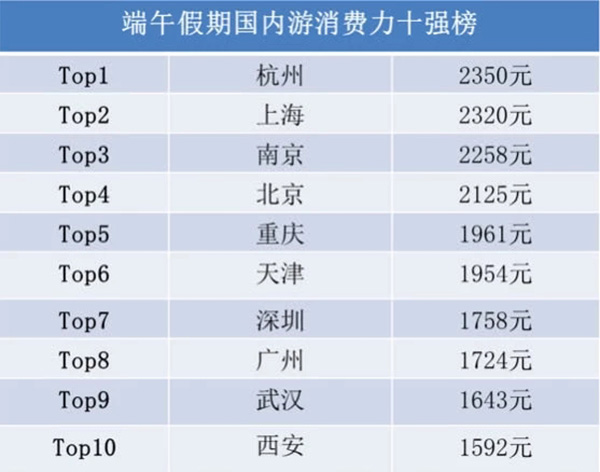 哪些城市居民的平均消费最高?从目前预订端午国内跟团游、自由行的单次人均花费看,“消费力前十强城市”依次为杭州、上海、南京、北京、重庆、天津、深圳、广州、武汉和西安。这些城市端午旅游单次国内游人均花费超过1500元,杭州人均消费达2350元。
