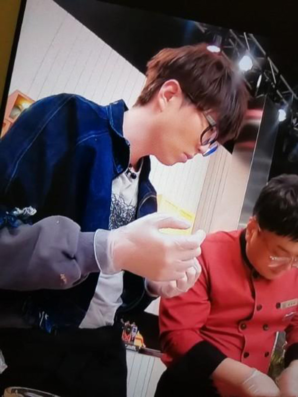 之后毛不易帮助主厨做菜,为主厨当助手,但是当毛不易戴上了手套之后,整个画面的画风瞬间就不一样了,大家平常做菜可能是将手自然放下,或者是按在桌子上,但毛不易一戴上手套,直接就摆出了“护士”的标准手型,看起来也是十分可爱了!