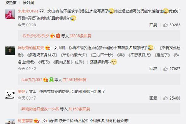 于是,网友们开始怀念周杰伦的经典歌曲,怀念“天青色等烟雨,而我在等你”这类脍炙人口的经典歌词。更有大批网友跑到了方文山微博评论区留言,呼唤他赶紧出山:“方文山,快回来上班。”“听到‘哥练的胸肌’,我真是醉了。”“快来救救杰伦小公举。”对于网友们的抗议,周董仿佛延续其一惯的傲娇风格,“这是我的歌,不管好与不好,你不爱我拉倒。”